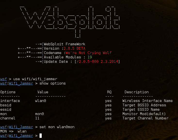 Перезапустите WebSploit и уже прямо сейчас можете работать с Wifi_Jammer. Конечно же, теперь не забывайте вводить set mon wlan0mon.