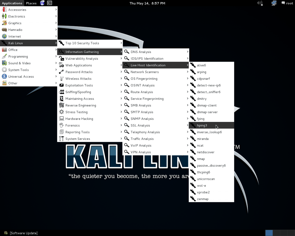 Нам нужен установленный Hping3. Он уже установлен в стандартном пакете Kali Linux и Backtrack.
