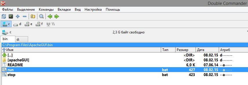 Теперь переходим в каталог, где установлен ApacheGUI, а точнее в папку bin. В моём случае, полный путь C:Program FilesApacheGUIbin: