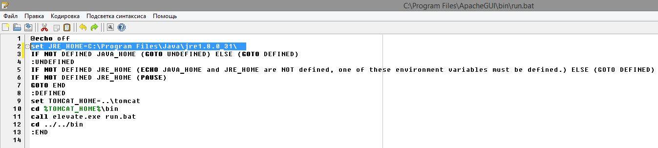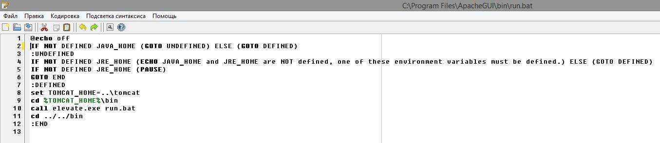 Нас интересуют два файла: run.bat и stop.bat. Окройте файл run.bat любым текстовым редактором. Это крошечный файл, в котором 12 строк: