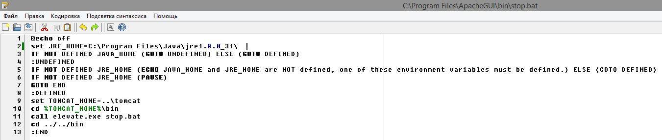 Идентичную процедуру проделываем с файлом stop.bat, т. е. открываем текстовым редактором, после первой строчки добавляем строку set JRE_HOME=путь_до_JRE и сохраняем/закрываем.