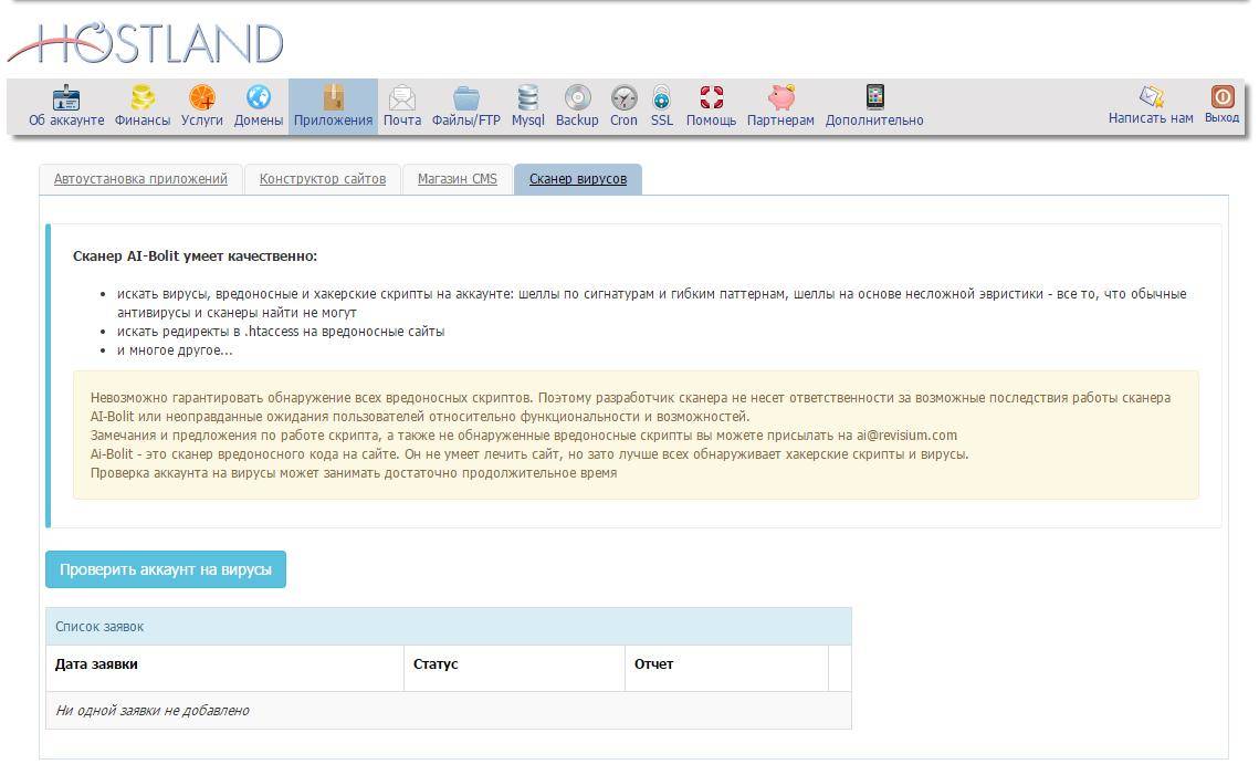 Очень просто: авторизуйтесь в панели управления хостингом. Кликните на иконку «Приложения», далее выберите вкладку «Сканер вирусов».