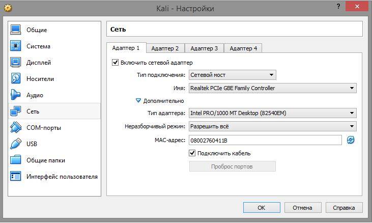 Третье: в настройках виртуальной машины перейдите к «настройкам сети». Там по умолчанию стоит NAT, вместо него выберите «сетевой мост». Там, где «неразборчивый режим», выберите «разрешить всё».
