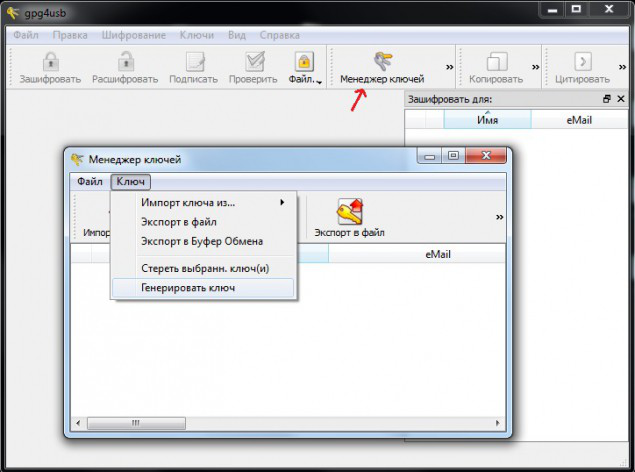 При открытии приложения появится окно «Мастер первого запуска», в нём можете либо указать дополнительные настройки, либо закрыть его. Теперь, нужно сделать свою пару PGP ключей (открытый и закрытый) PGP. Жмём кнопку «Менеджер ключей». В открывшимся окне нажимаем вверху посередине «Менеджер ключей». В открывшемся окне, в верхнем меню пункт «Ключ»->«Генерировать ключ».