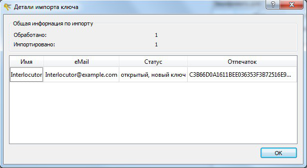 Далее, нужно импортировать публичный ключ собеседника. Копируем ключ собеседника, в верхнем меню программы жмём «Ключи»->«Импорт ключей из…»->«Буфер обмена». Появится окно «Детали импорта ключа».