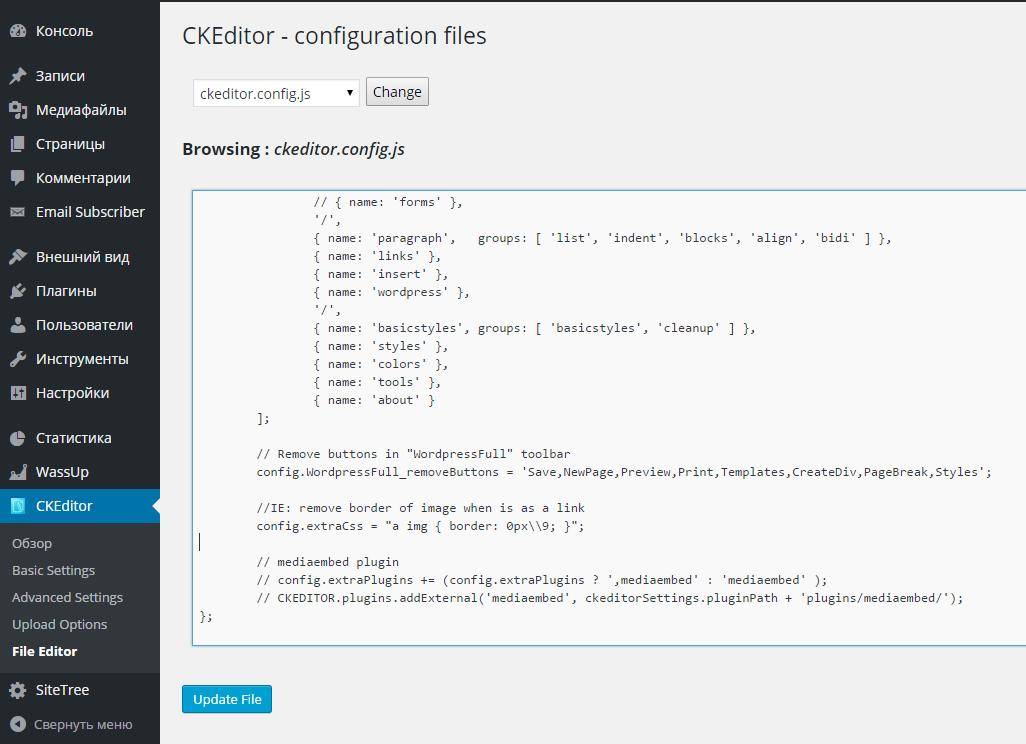 Теперь возвращаемся в панель WordPress. Во вкладке CKEditor выбираем File Editor: