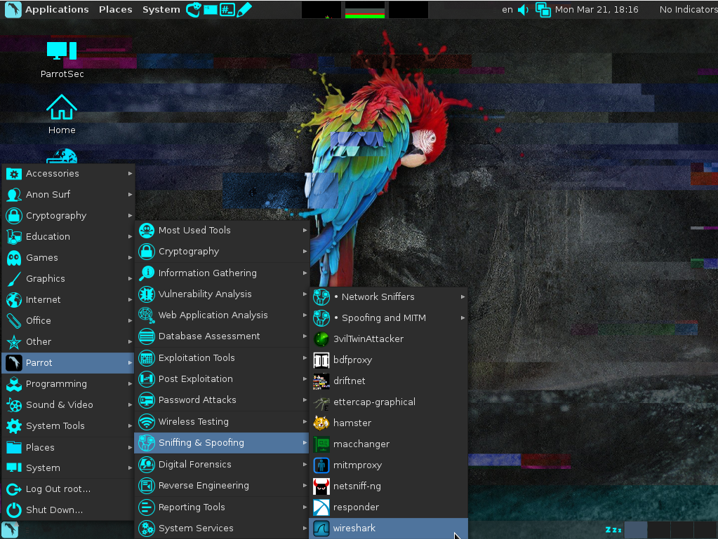 Ну с начала мы находим программу в списке или через консоль (ettercap —gtk)(она находится там же где и акула-wireshark но выше на 6 позиций)