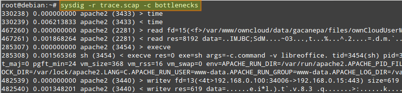 Как вариант, вы можете осуществить оффлайн анализ производительности сервера. В этом случае вы можете сохранить полный след sysdig’а в файл, и запустить чизел bottlenecks на этот след как показано: