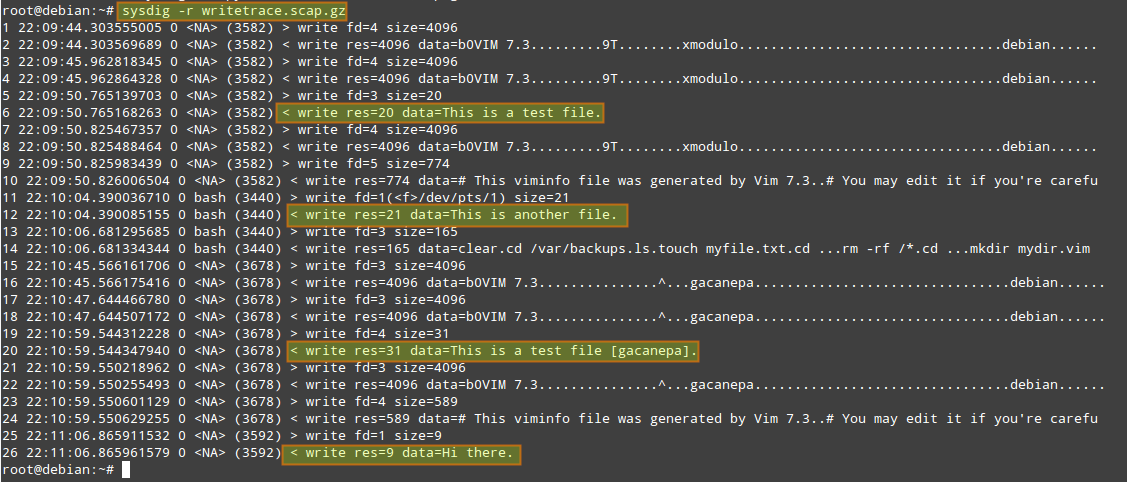 # sysdig -r /mnt/sysdig/debian.scap.gz -c spy_users "user.name=xmodulo"