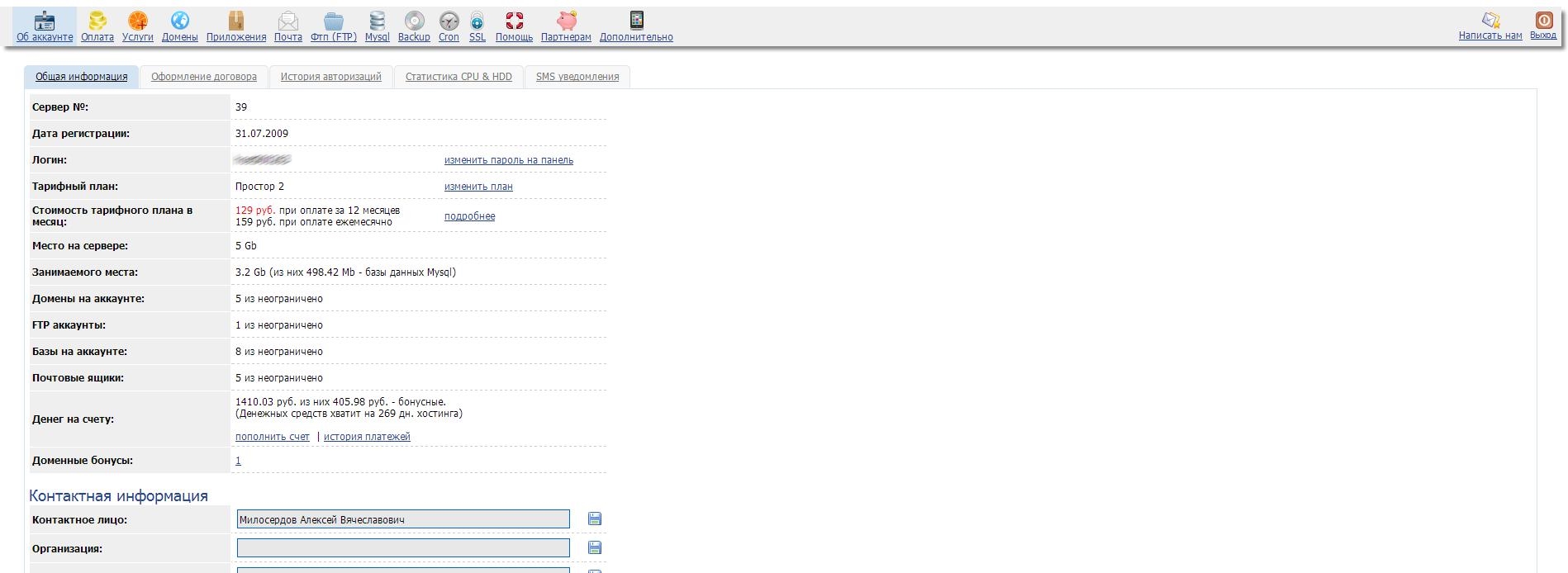 Вот так выглядит моя административная панелька — хостинг оплачен на год вперёд и у меня опять есть бонус — право бесплатно продлить или купить новый домен: