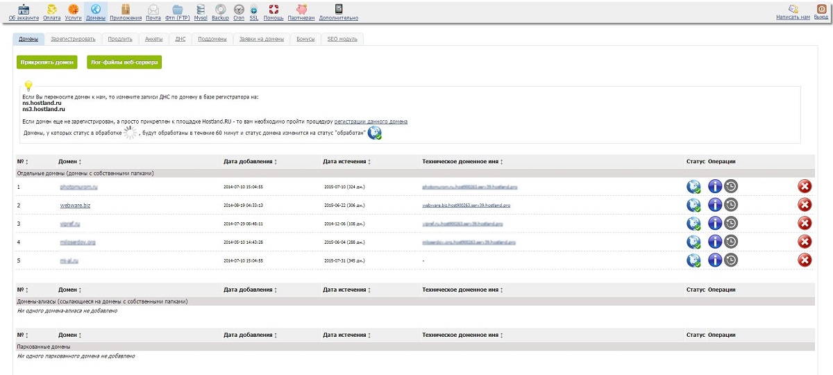 Вот мои домены (даты добавления неверные, некоторым моим доменам уже много лет — фактически, там указаны даты продления):