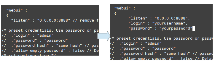 "listen" : "0.0.0.0:8888", "login" : "ваше_имя", "password" : "ваш_пароль"