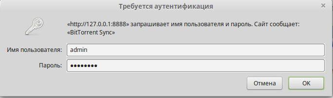 Сейчас откройте веб-браузер и наберите в адресной строке сервера Linux IP и порт, который прослушивает btsync (в моём случае 127.0.0.1:8888), вводим учётные данные: