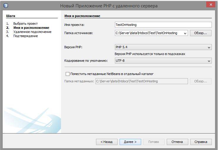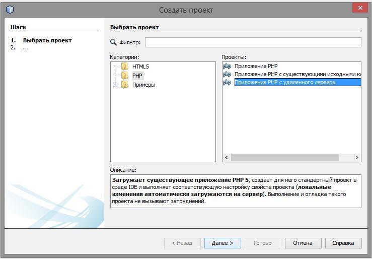 Открываем NetBeans и выбираем «Создать проект». Там где «Категории» выбираем PHP. А в «Проекты» выбираем «Приложение PHP с удалённого сервера»: