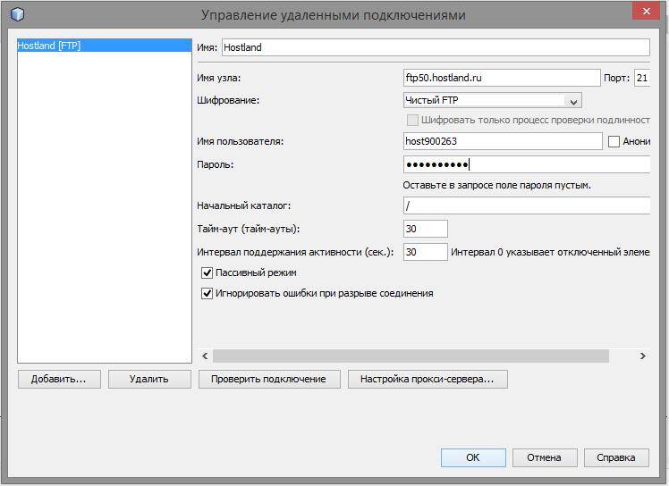 При регистрации хостинга вам пришлют необходимые данные, в том числе для FTP. Я ввожу свои данные. Нужно заполнить «Имя узла», «Имя пользователя» и «Пароль». Остальное можно не менять.