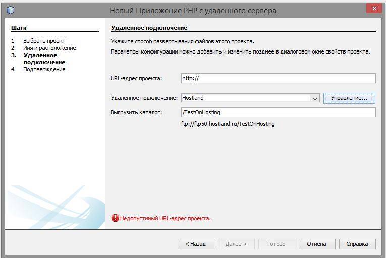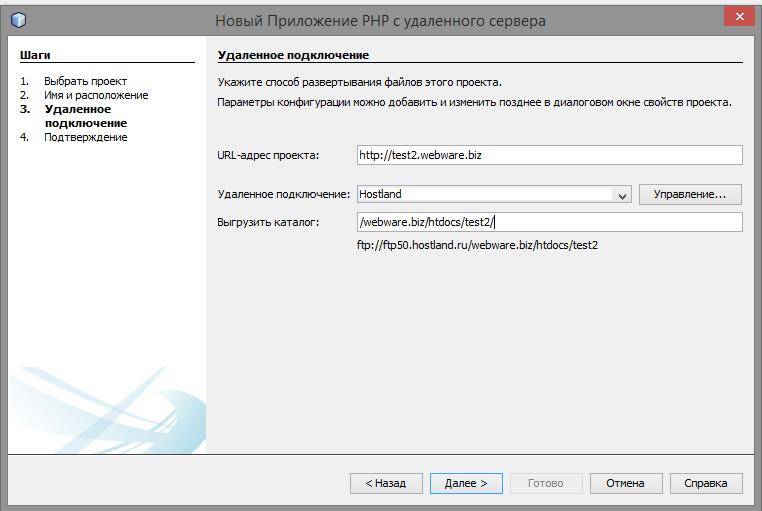 Если в настройках FTP вы выбрали корневой каталог, то в поле «URL-адрес проекта» введите просто ваш домен (например, в моём случае это был бы yg140.servegame.com). Но я выбрал поддомен, поэтому я вводу адрес поддомена test2.yg140.servegame.com