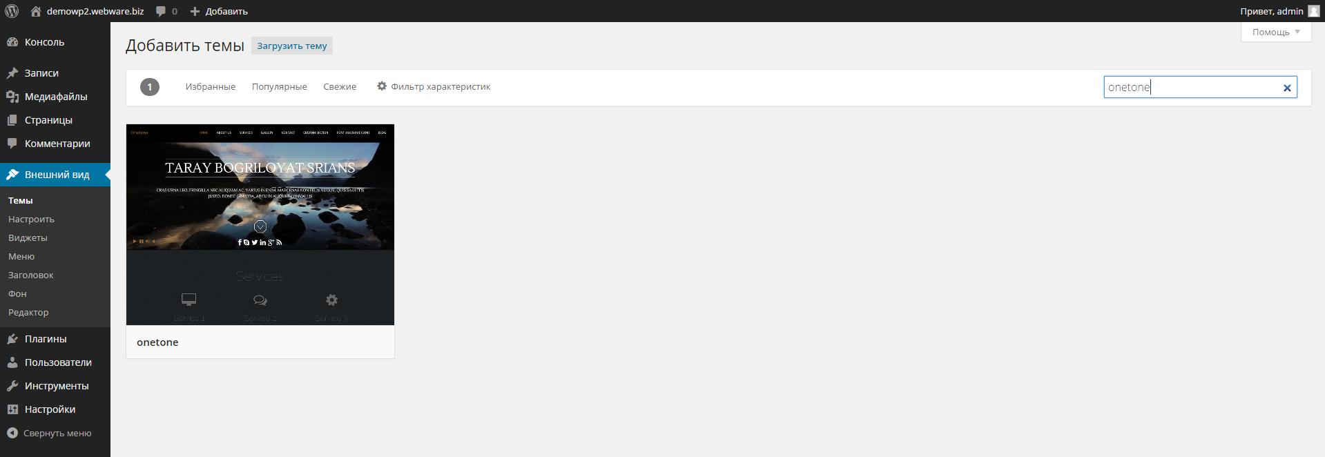 В консоли WordPress ищим вкладочку «Внешний вид» и в ней выбираем «Темы». Кликаем «Добавить новую» и в окошечке поиска набираем «onetone»: