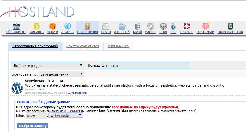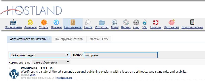 2. Перейдите на вкладочку «Приложения» . В поле поиска введите «wordpress»: