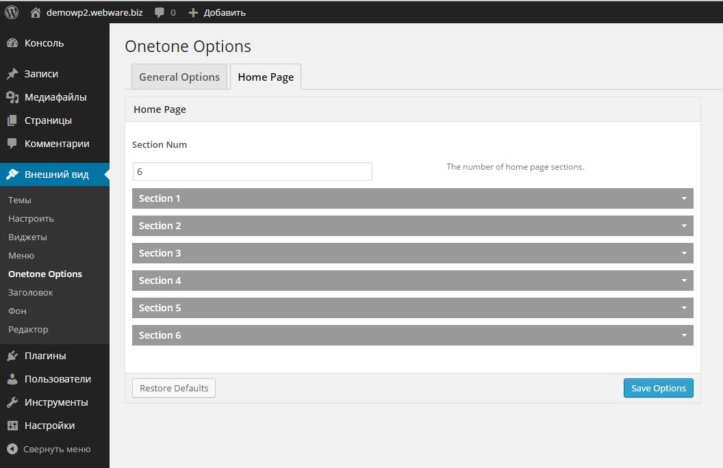 4. Опять переходим в раздел «Внешний вид» и выбираем там пункт «Onetone Options» и переходим во вкладочку «Home Page»: