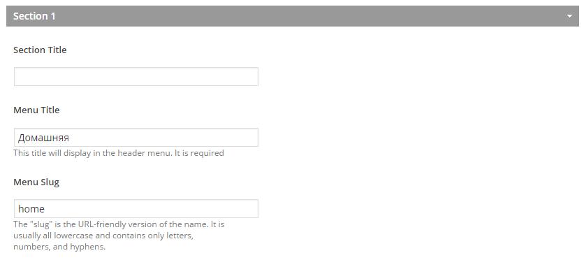 Заполняем «Menu Title» и «Menu Slug». Первое — это то название, которое отображается в меню. Важно не оставлять пункт «Menu Slug» пустым!