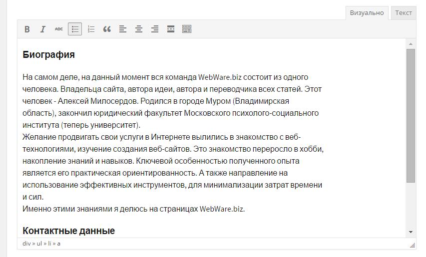 В редакторе набираем информацию о себе, добавляем ссылки на социальные сети: