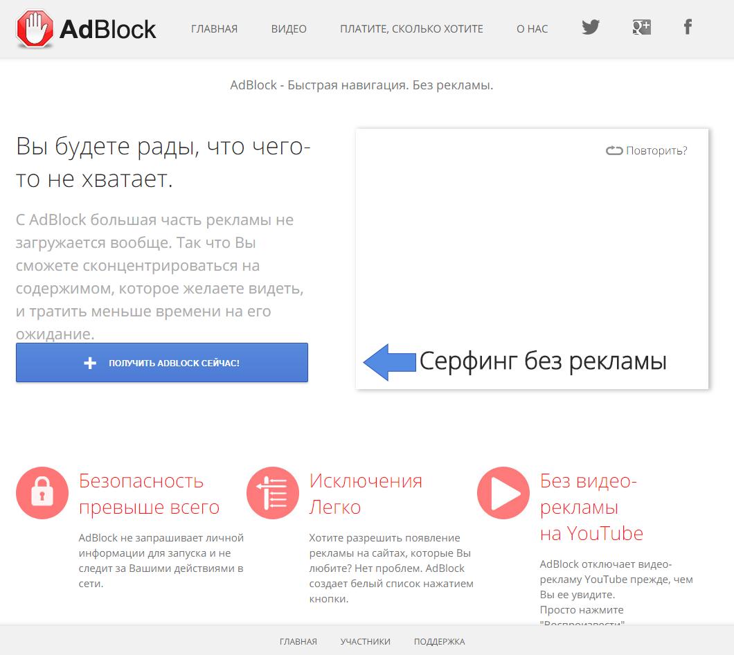 Переходите на сайт AdBlock и нажимаете кнопочку «Получить AdBlock сейчас!». Для каждого браузера свой плагин, поэтому вас перебросит на страничку для вашего браузера. Всё это совершенно бесплатно, не нисёт никаких скрытых угроз — жизнь просто становиться лучше, реклама исчезает просто везде: с сайтов, из социальных сетей, из видео на YouTube и т. д., везде.