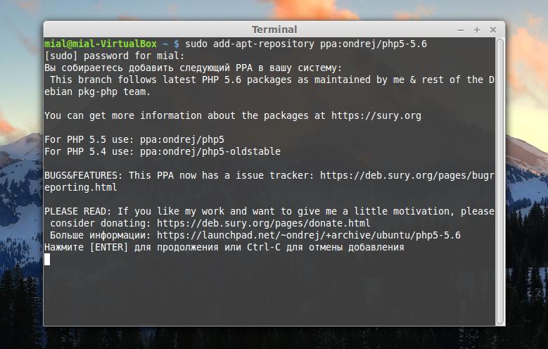 Ubuntu (и, естественно, Linux Mint) по умолчанию поставляются с PHP 5.5, но если вы хотите использовать PHP 5.6, то вас от этого отделяют всего три строки в командной строке. Говорят, что нижеследующая инструкция для «чистой установки». Т.е. для тех, кто ещё не успел поставить PHP, и что она не для обновления уже установленного PHP. Я не знаю, но у меня всё сработало прекрасно, хотя PHP я установил вместе с свервером в той инструкции, на которую выше дал ссылку. При установке на «чистую» систему, всё должно пройти идеально — проверено на многих машинах. При обновлении существующего PHP появятся дополнительные вопросы о конфигурационном файле (я поменял на новый из пакета, но вы можете поступить по своему желанию — синтаксис файла настройки одинаков для PHP 5.5 и для PHP 5.6.