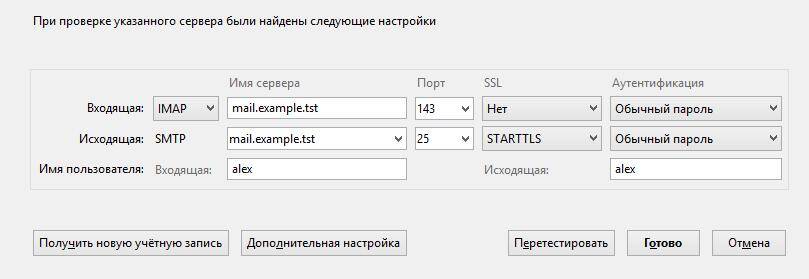 Почтовый сервер теперь готов к использованию. Почтовая учётная запись может быть настроена с использованием вашего любимого почтового клиента на настольном компьютере, ноутбуке, планшете или телефоне. Можно настроить и webmail (почту с веб-интерфейсом) на сервере, но инструкция по webmail будет в следующих уроках. На данном этапе, почтовая программа Mozilla Thunderbird определила следующие настройки для моего сервера: