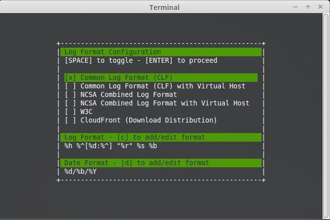 Когда вы запускаете GoAccess впервые, вас встретит следующий экран, в котором нужно выбрать дату и формат лога. Вы можете переключаться между опциями, используя пробел, а для продолжения нажать F10. По поводу даты и форматов логов, возможно, вы захотите обратиться к документации Apache, если вам нужно освежить вашу память.