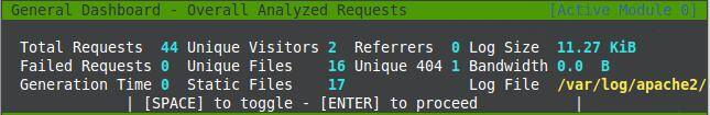 Для начала использования GoAccess, просто запустите её, указав путь до логов доступа (файл access) Apache.
