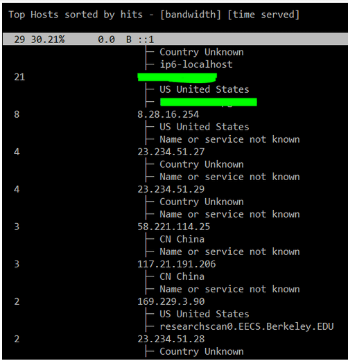 Для отображения информации расположения GeoIP, откройте детальный просмотр секции Хосты (Hosts) и вы увидите расположение клиентских IP адресов, которые выполняли запросы на ваш веб-сервер: