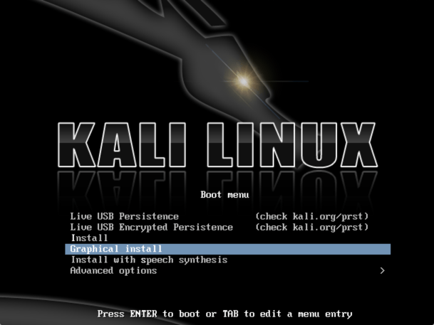 - Вас должен поприветствовать загрузочный экран Kali. У вас на выбор будут следующие варианты ‘Live’ (работа с внешнего носителя без установки), ‘Graphical Install’ (графическая установка) или ‘(Text-Mode) Install’ (текстовый режим установки). В этом примере мы выбрали графическую установку.