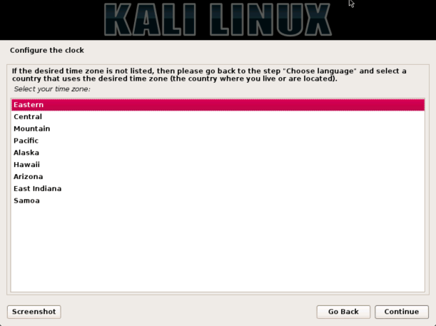 - Установщик скопирует образ на ваш жёсткий диск, прозондирует ваш сетевой интерфейс и затем попросит вас ввести имя хоста и доменное имя для вашей системы. В примере ниже, мы ввели ‘kali’ в качестве нашего имени хоста.