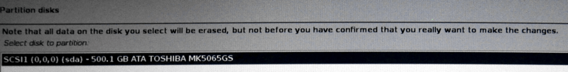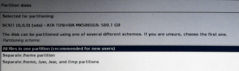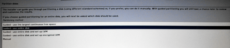 - Теперь инсталятор прозондирует ваши диски и предложит вам на выбор пять вариантов. В нашем примере мы используем отдельный раздел, который был сделан во время режима live, следовательно, мы выбрали ‘Guided – use the largest continuous free space’ (Авто — использовать наибольшее свободное место).