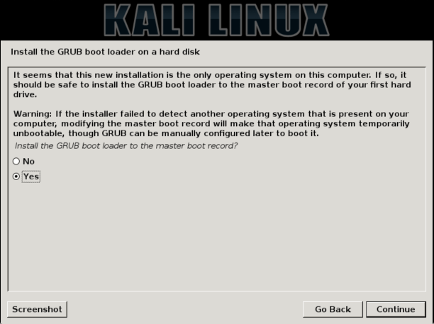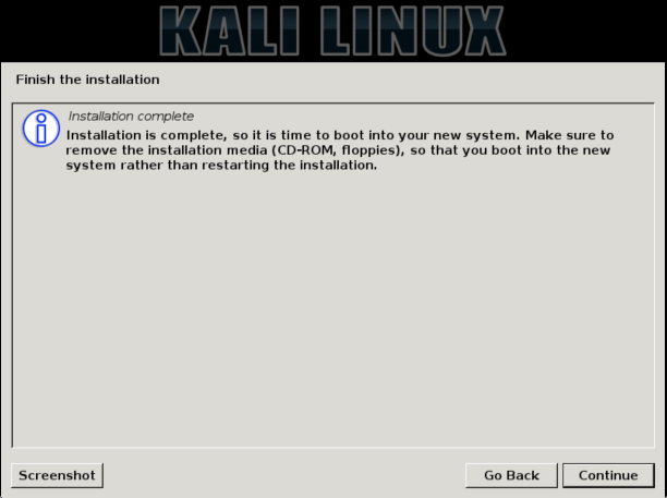 - Наконец кликнете «Продолжить» для завершения установки Kali Linux. Очень рекомендуется, чтобы вы перезапустили вашу машину на этой стадии.