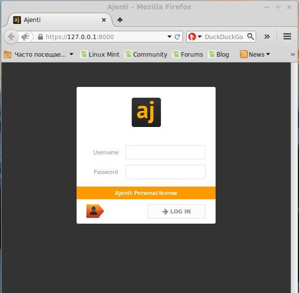 Прямо в вашем браузере наберите https://<ip-адрес-сервера>:8000 и вы увидете следующий веб-интерфейс Ajenti для входа.