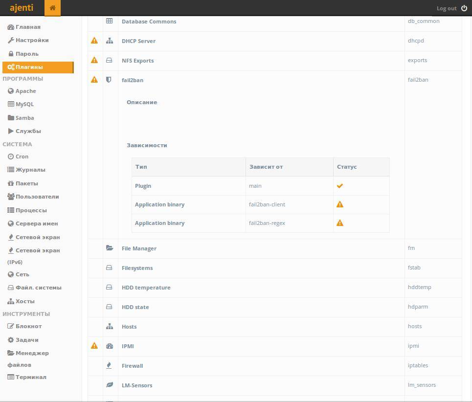 Ajenti поставляется с рядом плагинов специфичных для приложений, которые делают Ajenti очень расширяемой. Когда вы устанавливаете новую программу на ваш VPS, соответствующий плагин Ajenti (если такой есть) будет автоматически включен для управления этой программой. Раздел меню «Плагины» покажет, какие плагины доступны/включены, и какие плагины ассоциированы с каким софтом.
