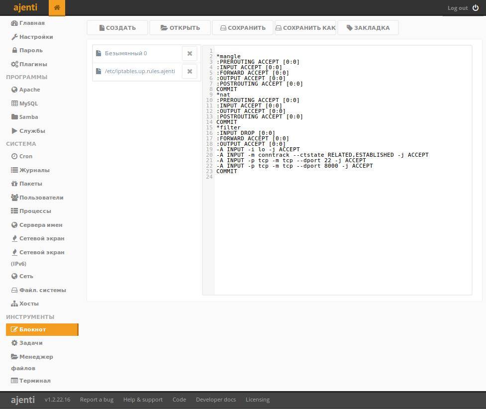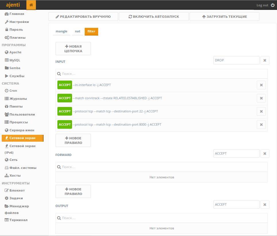 Ajenti позволяет вам управлять правилами файервола (iptables or CSF) двумя способами. Первый — это дружественный пользователю интерфейс веб-панели, и другой — это прямое редактирование сырых правил сетевого экрана.