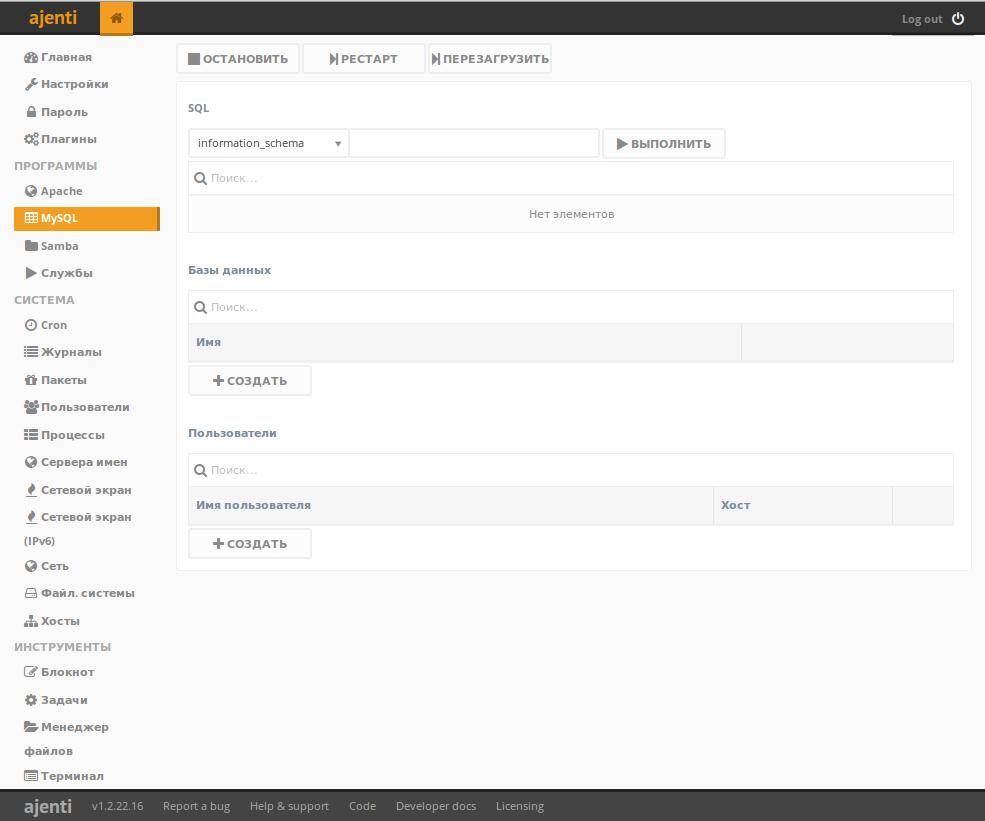В секции «ПРОГРАММЫ» в левой панели, вы увидите список установленных служб. Когда вы установите какое-либо новое серверное программное обеспечение, поддерживаемое в Ajenti, программа автоматически добавится в список сразу после перезапуска службы ajenti.