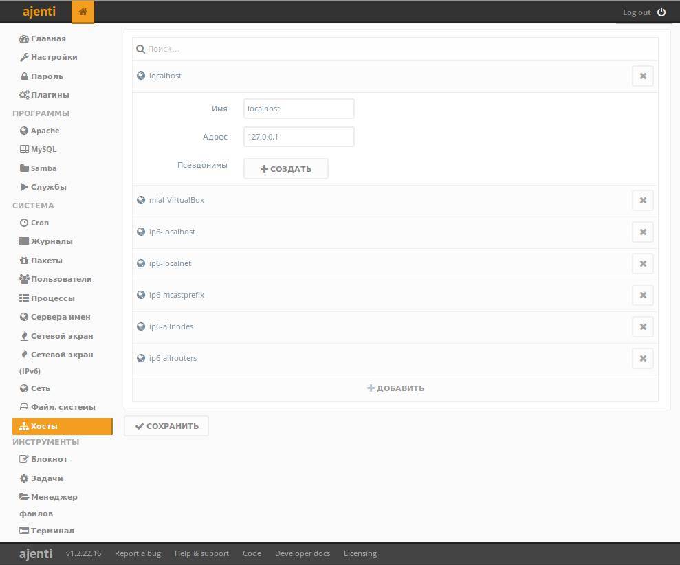 Ajenti позволяет вам с лёгкостью настраивать различные распространённые серверные программы, такие как Apache/nginx, Samba, BIND, Squid, MySQL, cron, firewall и так далее, это отличный способ сохранить время при администрировании своего экземпляра VPS. Для производственной среды Ajenti также предлагает адд-оны и поддержку платформ для управления виртуальным хостингом и пользовательских веб-разработок графического интерфейса.