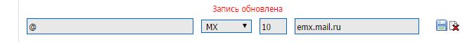 Ищем строку в которой «Тип» — MX. Поле «Имя» заменяем на @, а поле «значение (IP/host.)» заменяем на «emx.mail.ru», приоритет не трогаем. В итоге, у меня получилось так: