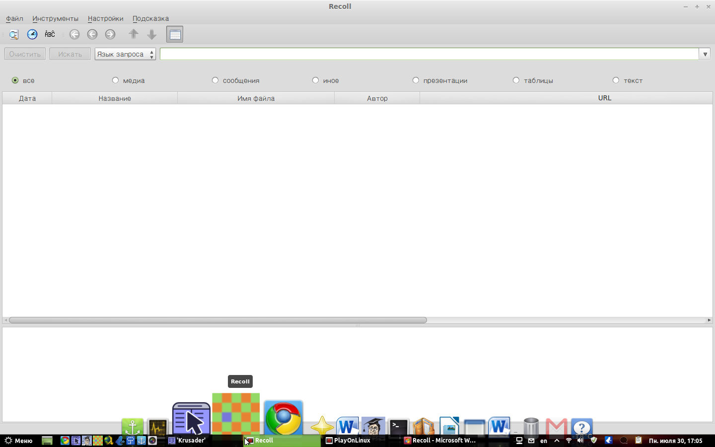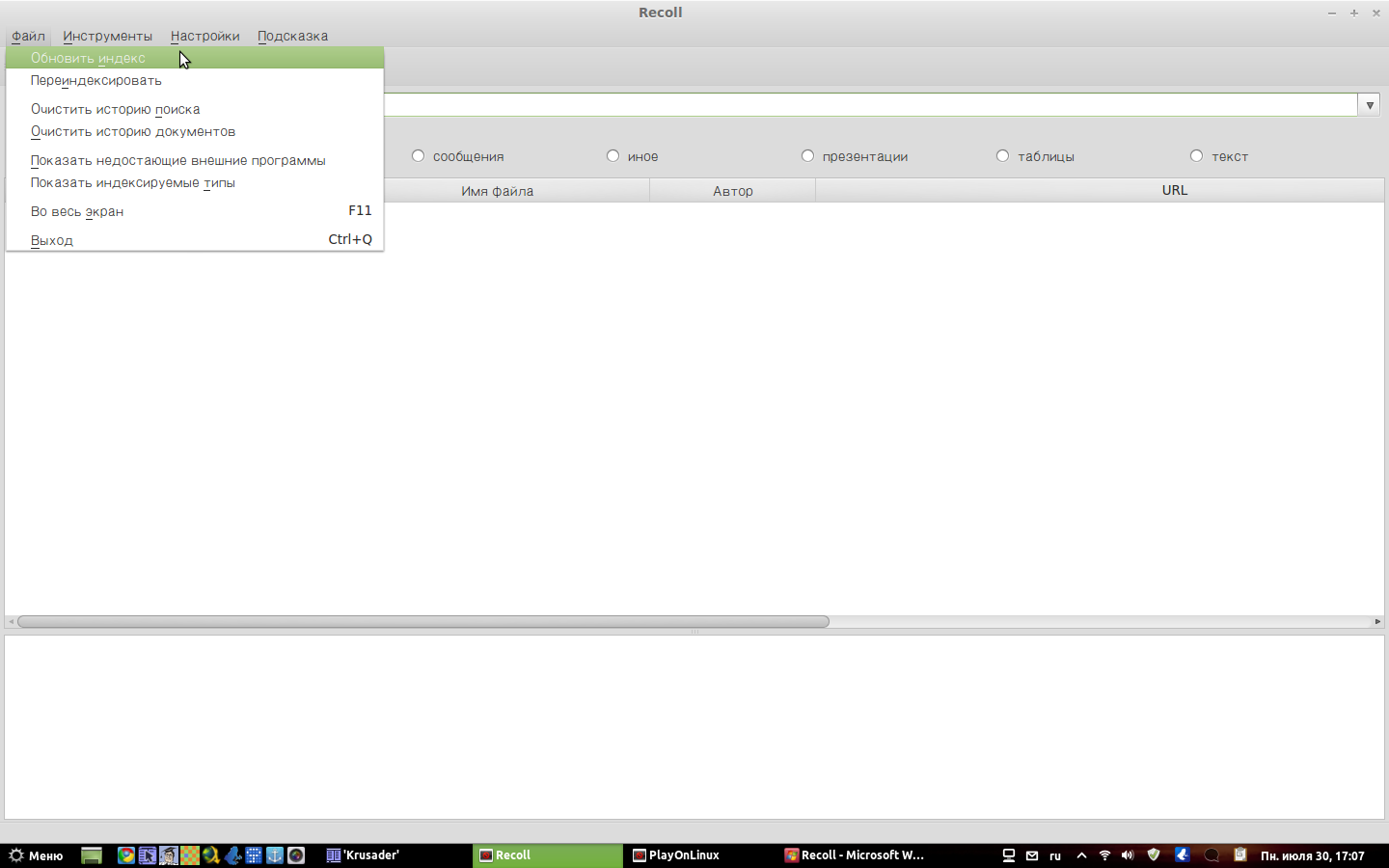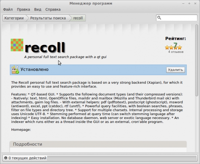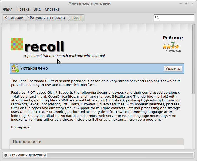 Я перелопатил почти с десяток поисковых систем на Linux, среди которых были в том числе Tracker, Recoll, Strigi¸ Deskbar, Peagle, Yabi¸ Catfish. Почти все они оказались заброшенными, неподдерживаемые больше разработчиками, некоторые просто не захотели работать или оказались с примитивной функциональностью. Скажу честно, был момент, когда я отчаялся, что уже не найду ничего стоящего. К счастью, это оказалось не так. Ситуацию спасла программа Recoll. Официальный сайт.