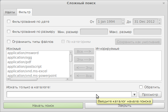 - искать только в определённом каталоге (или во всех каталогах, кроме одного).
