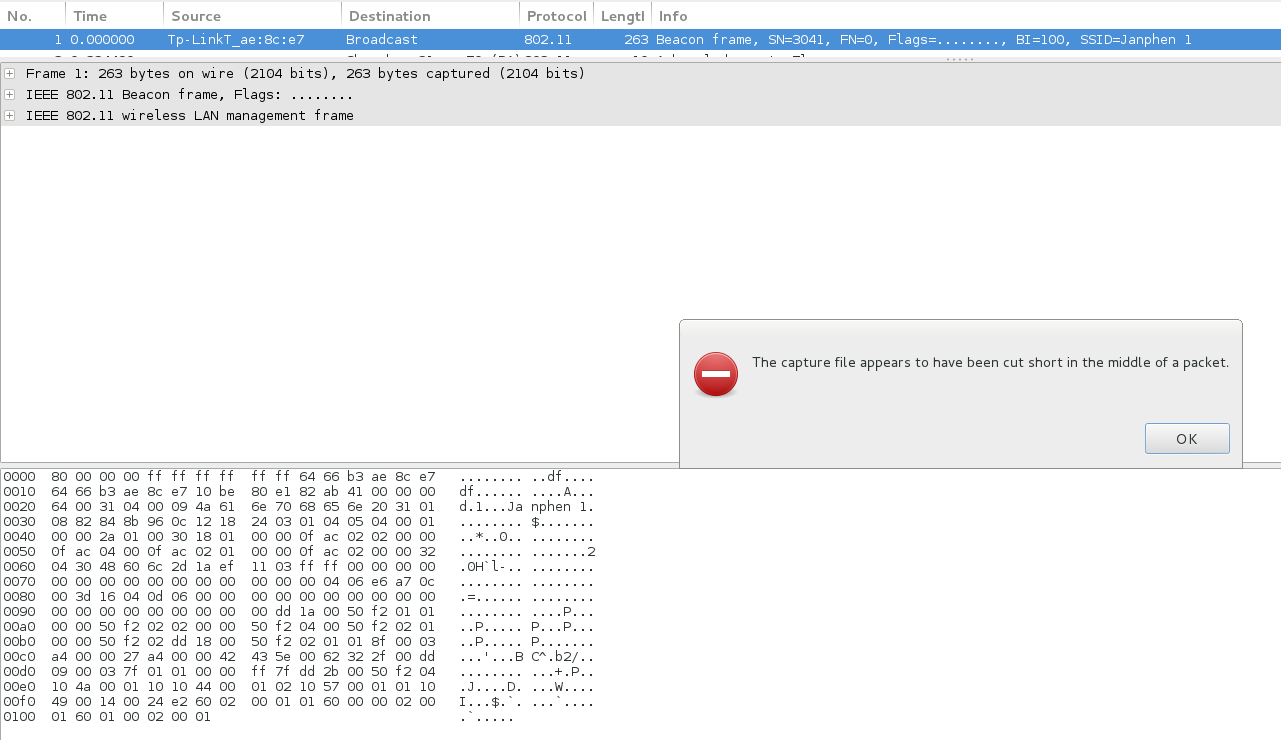 При самом запуске вышеприведённой команды ещё раз появится ошибка, связанная с неполнотой исходного файла. Но новый файл (wscapture-01_stripped.cap) появится в любом случае.
