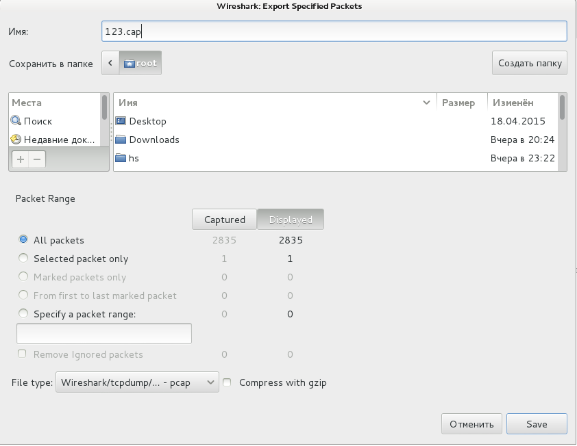 Второй способ — пересохранить файл с помощью Wireshark. Нужно выбрать не «Сохранить как», а именно «Экспортировать». Сохранить нужно всё — выбрать "save displayed packets".