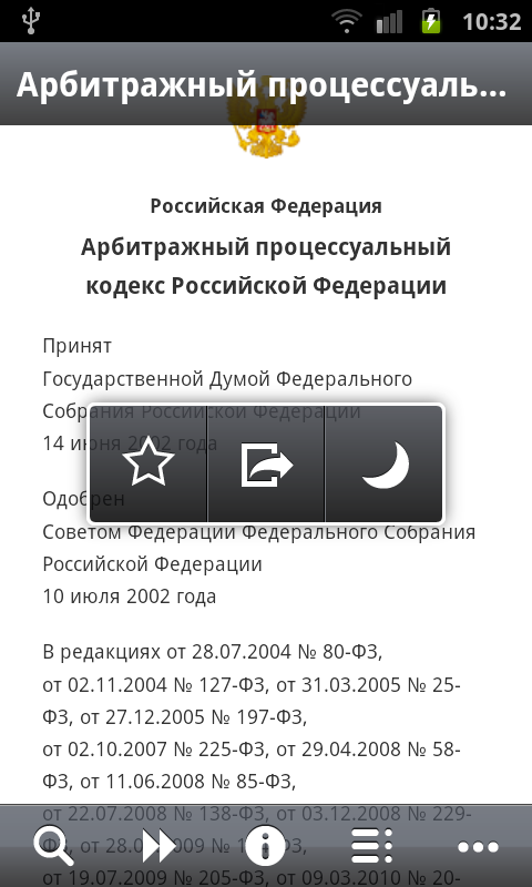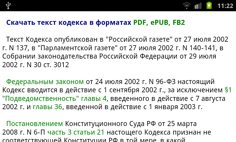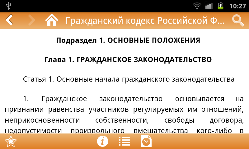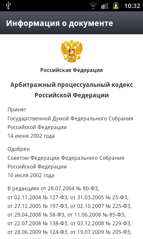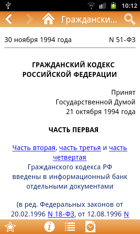 Право.ru. Ключевая особенность программы в том, что ВСЕ документы хранятся в памяти телефона. Доступ в интернет нужен только для обновления. Меню сделано очень продуманно и удобно.