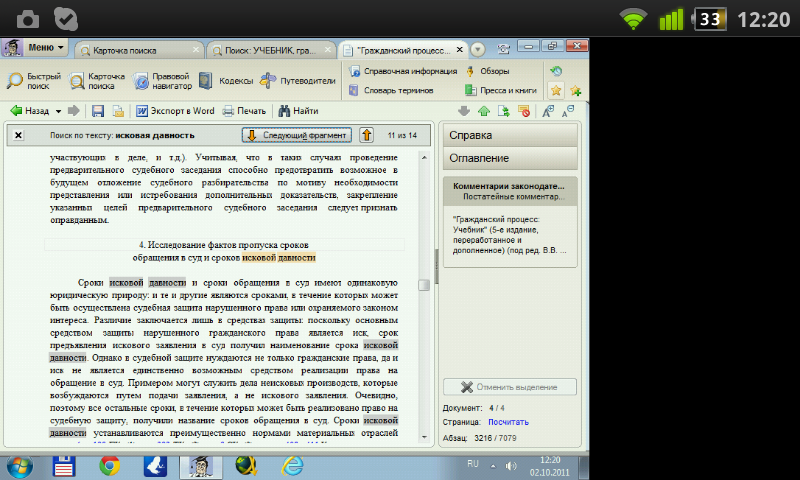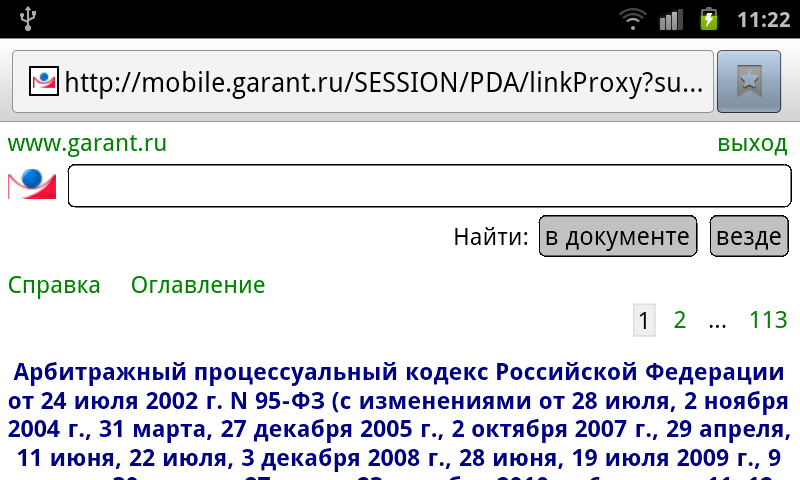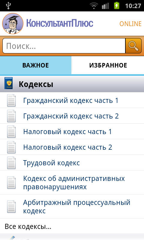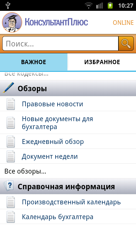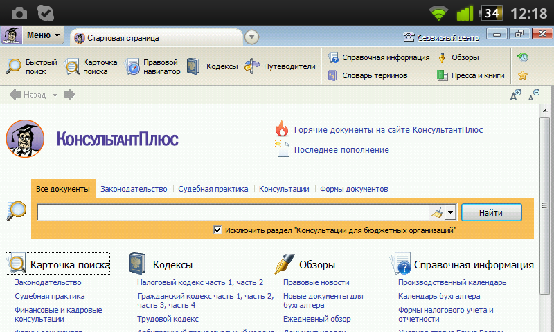 "КонсультантПлюс". Его интернет версия для мобильных приложений появилась относительно недавно. Раньше, доступ к он-лайн базе можно было получить только через мобильный браузер Firefox. При этом интерфейс программы отображался примерно также, как на настольных ПК. Это было привычно, но для мобильных устройств не совсем удобно.