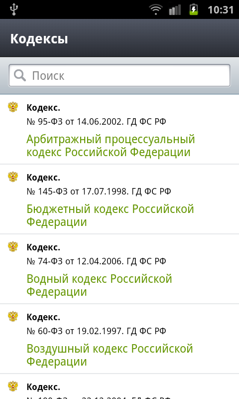 Имеется быстрый поиск к кодексам (в определённый момент, программа кажется очень похожей на мобильный он-лайн "КонсультантПлюс").
