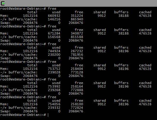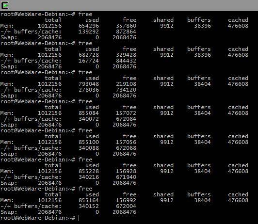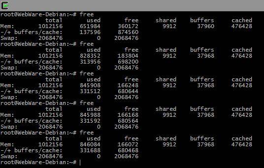 А это тесты памяти, которые я проводил с интервалами в несколько секунд на сервере, который подвергался атаке. Первый замер сделан до атаки, последующие — во время. Видно, что количество свободной памяти уменьшалось очень стремительно вплоть до того момента, пока сервер не лёг.