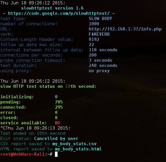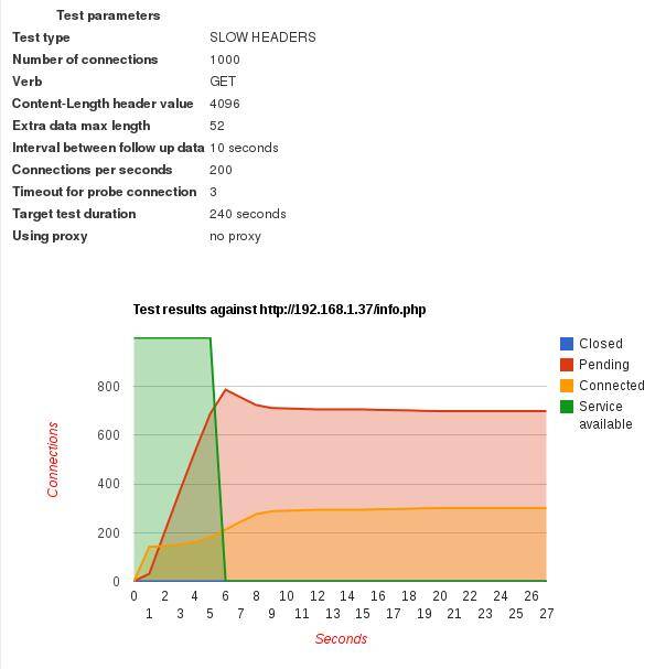 slowhttptest -c 1000 -H -g -o my_header_stats -i 10 -r 200 -t GET -u http://192.168.1.37/info.php -x 24 -p 3